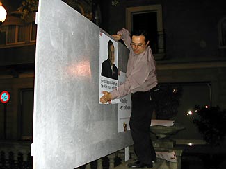 Santi Fontbona enganxant els seus propis cartells, acompanyat
