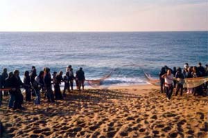 TIRADA A L´ART Són molts els arenyencs que conèixen aquesta activitat tradicional que es porta a cap dos cops a l'any a Lloret de Mar. Gairebé tothom que s'acosta enyora uns temps on l'home vivia més a prop del mar; temps on l'activitat pesquera era artesanal i respectuosa amb el medi. Moltes de les ancestrals tècniques de pesca han anat desapareixent, i activitats com aquesta 'tirada a l'art' popular ajuden a que no caiguin en l'oblit. Us volem detallar com es viu una d'aquestes matinals que ens fa reviure altres temps. A primera hora del matí la gent es concentra al lloc anomenat 'n'es Trajo d'en Reyné', a la platja de Lloret per a realitzar la tirada a l'art. L'acte concentra força gent disposada a recordar aquesta tradició que havia estat molt habitual a platges com les de Lloret, i que avui dia només està a la memòria dels pescadors més grans. La tirada comença carregant l'art en una barca (antigament es feien servir caros de fusta, però avui ja no en queda cap a la nostra costa que pugui navegar). Les platges on es cala aquest tipus d'art han de ser de fons sorrencs per evitar que la xarxa s'enredi entre les roques i que sigui impossible llevar-la des de la platja. L'embarcació descriu un semicercle des d'un punt de la platja a un altre, amb una separació d'uns 200 metres de cap a cap, calant l'art en el seu recorregut, i deixant els caps en els seus extrems que és per on les colles començaran a estirar l'art. A les fotografies podem observar com a força de braços es puja la barca a la platja després d'haver calat l'art.